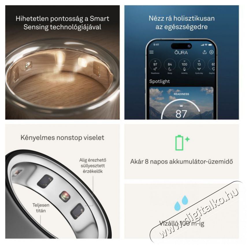 Ellenálló titán a mindennapi viseléshez Az Oura Ring 4 okosgyűrű kiváló minőségű titánból készült, ami könnyebb, mint egy hagyományos karikagyűrű, hipoallergén, és úgy tervezték, hogy hosszú éveken át bírja a használatot. Az okosgyűrű akár 100 méteres mélységig vízálló, ellenáll a szélsőséges körülményeknek – legyen szó szaunáról vagy jeges fürdőről, és strapabíróságának köszönhetően még a legmozgalmasabb életstílus mellett is megbízható társad marad. Ez egy olyan kiegészítő, ami nem csak stílusos, hanem a komoly terhelést is kibírja. A beépített érzékelők emellett kényelmes viselést biztosítanak anélkül, hogy bármilyen zavaró tényezőt jelentenének a mindennapok folyamán vagy alvás közben.