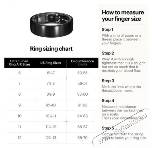 - A megfelelő gyűrűméretet a mellékelt táblázat segítségével, az Ultrahuman Ring Sizer alkalmazáson keresztül (csak iOS) vagy atesztkészlet