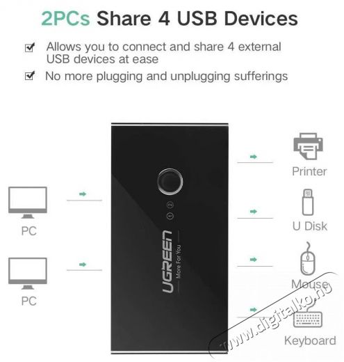 Négy eszköz két számítógéphezAz Ugreen USB hub lehetővé teszi két számítógépnek akár négy USB eszköz megosztását. Így megoszthattok egymás között nyomtatót, szkennert, egeret, billentyűzetet, USB-meghajtót és más eszközöket, például egy kis irodában vagy otthon. A váltás egyik számítógépről a másikra nagyon egyszerű, elég hozzá egyetlen gombnyomás.
