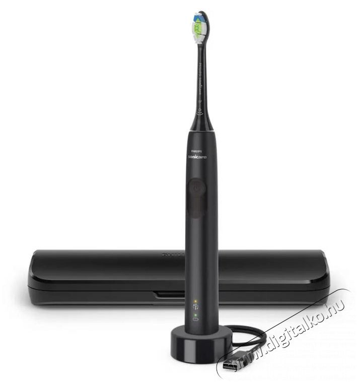 A csomagban található egy praktikus kemény tok, amely alkalmas utazáshoz és az otthoni higiénikus tároláshoz. A fogkefe és a fej tárolására is alkalmas. A fogkefe az USB-A csatlakozóval ellátott töltőállvány segítségével tölthető. Az adapter nem tartozék.