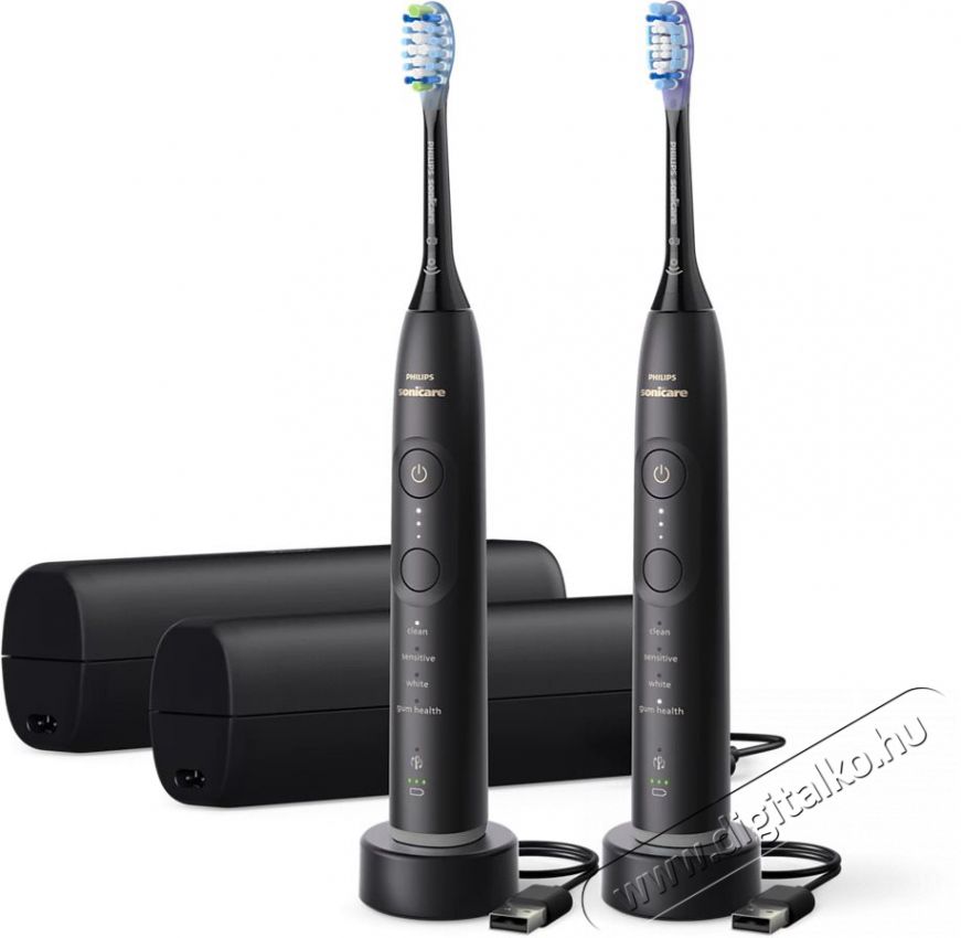 A csomag tartalmaz 2 Philips Sonicare szónikus fogkefét, 2 fejjel: Premium Gum Care és Premium Plaque Defence, valamint 2 töltőbázis. 2 újratölthető utazótasak is található az otthoni és az útközbeni higiénikus tároláshoz. Teljes feltöltéssel a készülék akár 3 hétig is használható rendszeres fogmosás mellett.. A csomag nem tartalmazza az aljzatadaptert.