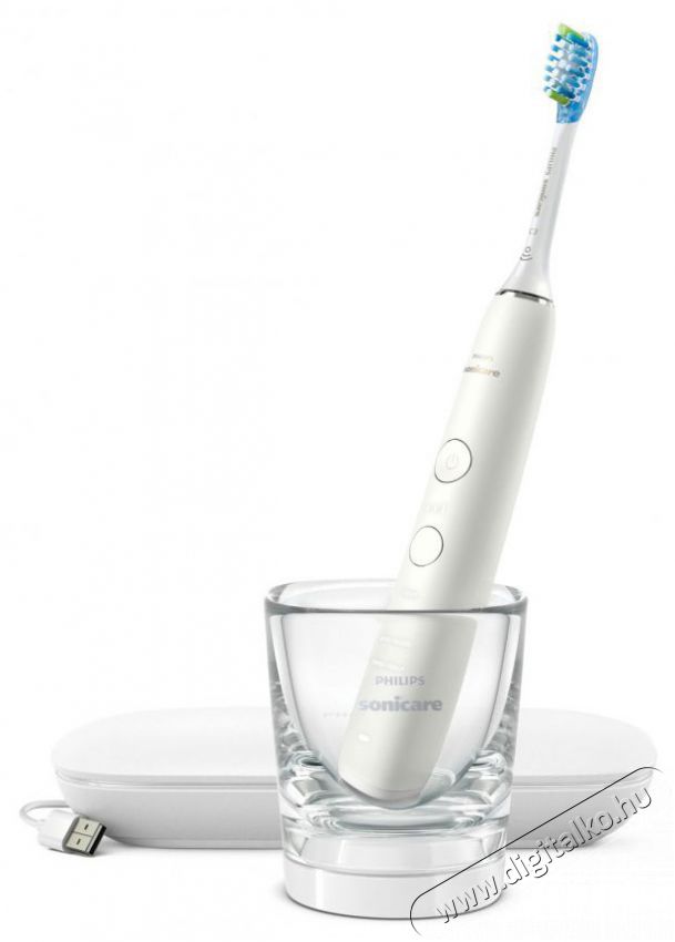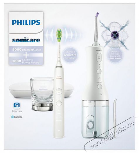 Mindig van mód a jobb tisztításra. Tapasztald meg a tökéletesen tiszta fogak és fogközök szenzációsan friss érzését! A Philips Sonicare 9000 DiamondClean elektromos fogkefe és egy nagy teljesítményű hordozható szájzuhany kombinációja a lehető legalaposabb mély tisztítást és kíméletesebb ápolást biztosítja a szájnak. Az idő töredéke alatt eltávolítja a lepedék és a törmelék akár 99,9%-át a fogak közül, a fogfelszíneken és az íny vonalán. A fogkefe nyomásérzékelővel van felszerelve, és figyelmeztet, ha túl nagy nyomást gyakorolsz a fogaidra és az ínyedre. Az intelligens mobilalkalmazáshoz csatlakoztatva azonnali visszajelzést kaphatsz a fogmosási rutinodról, valamint tippeket a még jobb fogmosási technikákhoz. A kefe automatikusan figyeli a kefefej kopási sebességét és kiválasztja a számára legmegfelelőbb tisztítási módot. A szájzuhany 60-90 másodperc alatt megszabadul a lepedéktől az egyedülálló fúvókakialakításnak és az X-alakú vízsugárnak köszönhetően, amely egyszerre több szájfelületet fed le. Mindkét készülék többféle fogmosási móddal és különböző intenzitású beállításokkal rendelkezik a maximális kényelem érdekében. A csomagban egy fehér fogkefetest, egy alapos lepedék eltávolításra tervezett kefefej, egy elegáns pohártöltő, egy kemény utazótok USB-töltéssel és egy hordozható, kétfúvókás szájzuhany található. Új generációs elektromos szónikus fogkefe. Erőteljes hordozható szájzuhany. Philips Sonicare és Quad Stream technológia a gyengéd tisztításért
