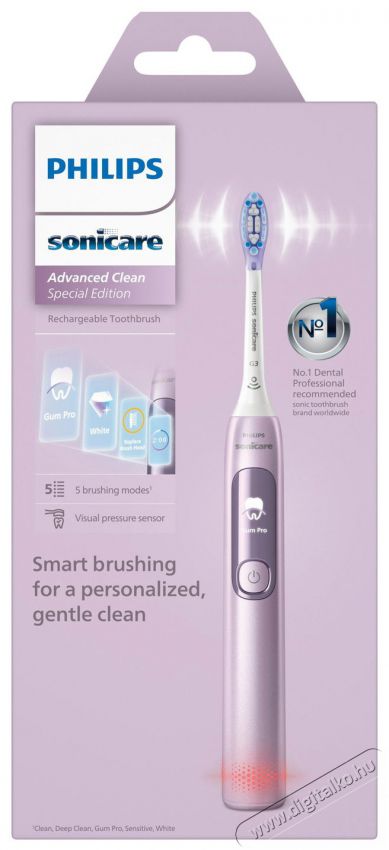 A kiváló Philips Sonicare szónikus elektromos fogkefe tiszta fogakat és egészséges mosolyt garantál anélkül, hogy el kéne hagynod az otthonodat. A fogkefe feje alaposan meg tudja tisztítani a nehezen elérhető helyeket, ráadásul kíméletesebben, mint a kézi fogkefe. A kiváló Philips Sonicare elektromos fogkefe 5 fogtisztítási módot biztosít. Az interaktív kijelző lehetővé teszi, hogy az összes fontos információt és figyelmeztetést figyelemmel kövesd. A kiváló Philips Sonicare elemes fogkefe odafigyel helyetted a fogmosás ajánlott idejére, a nyomásérzékelőnek köszönhetően pedig biztosan betartod a helyes fogmosási technikát, és nem gyakorolsz túl nagy nyomást a fogakra.