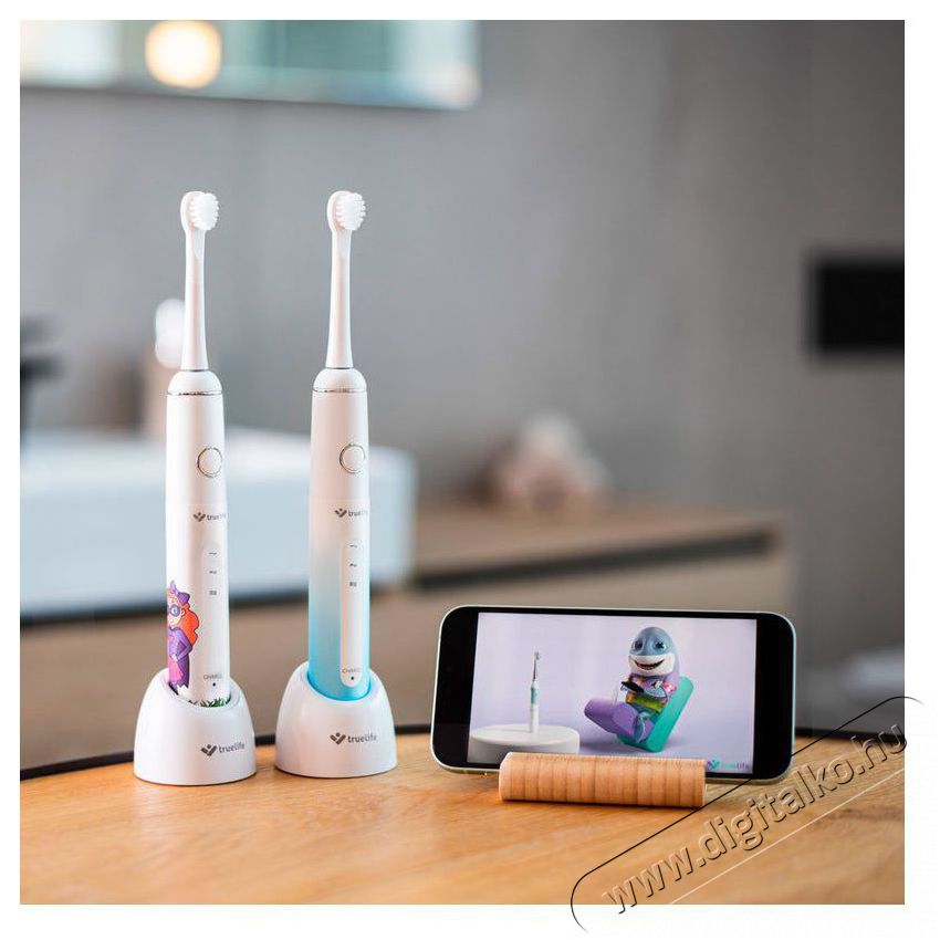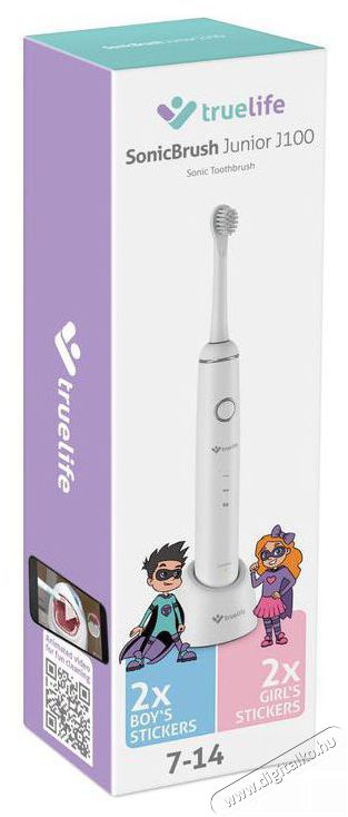 TrueLife SonicBrush Junior J100 szónikus fogkefe - ideális ápolás a gyermekek fogai számára (7 - 14 éves korig) A gyerekeknek gyakran kényszeríteniük kell magukat a fogmosásra, mert nem élvezik. De ha egyszer odaadod nekik a TrueLife SonicBrush Junior J100 fogkefét, amely a 7 és 14 év közötti gyermekek igényeihez van igazítva, számíthatsz rá, hogy szórakoztatónak fogják megélni ezt a tevékenységet. A színes matricák és a szórakoztató videóanimációk szórakoztatóvá teszik a mindennapi rutinokat, és a gyerekek alig várják majd a fogmosást. A TrueLife SonicBrush Junior J100 fogkefe teljes mértékben a gyermekek igényeihez igazodik, a markolat és a fej a gyermekek szájához méretezett, és kellően puha sörtékkel rendelkezik. A kefe a SonicTrue® szónikus technológiával büszkélkedhet,amely percenként akár 56 000 tisztító mozdulatot is képes elvégezni, hatékonyan eltávolítva a lepedék akár 99%-át. A TrueLife Sonic fogkefe újratölthető, és akkumulátora akár 35 napig is bírja. A gyermekek ezért kényelmesen magukkal vihetik a nyaralásokra. A csomag részét képezi egy utazótok és két Soft fej.
