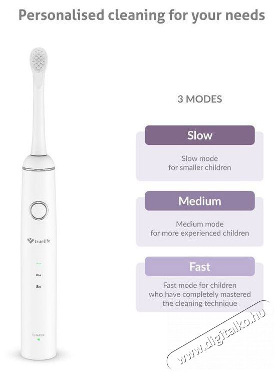 A fogkefét kicsik és nagyok egyaránt szeretni fogják A sörték finomsága és a méret a TrueLife sonic fogkefét tökéletessé teszik a gyermekek fogainak tisztítására. Tökéletesen illeszkedik a gyermekek kezébe, így a fogmosás sokkal könnyebb a számukra. Mindenki megtalálja a számára ideális fogmosási módot, ugyanis a TrueLife SonicBrush Junior J100 3 üzemmódot kínál - a kisebb gyermekek számára megfelelő a lassútól a gyorsabbig, amely inkább az idősebb gyermekek számára alkalmas. Teljesen önállóan fognak fogat mosni, és elsajátítják a fogmosási technikát. Az automatikus időzítő gondoskodik a megfelelő hosszúságú fogmosásról, hogy a gyermek ne csak ide-oda mozogassa a fogkefét.