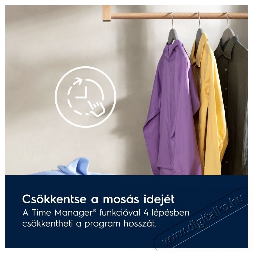 Csökkentse a mosás idejét a Time Manager® segítségével Ne mosson a szükségesnél hosszabb ideig. Használja a Time Manager® funkciót, csökkentse a program hosszát akár 4 lépésben, és végezzen a mosással rövidebb idő alatt.
