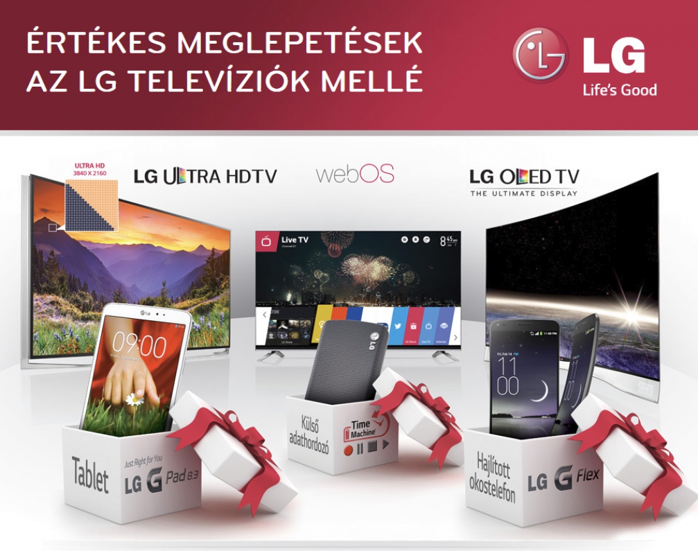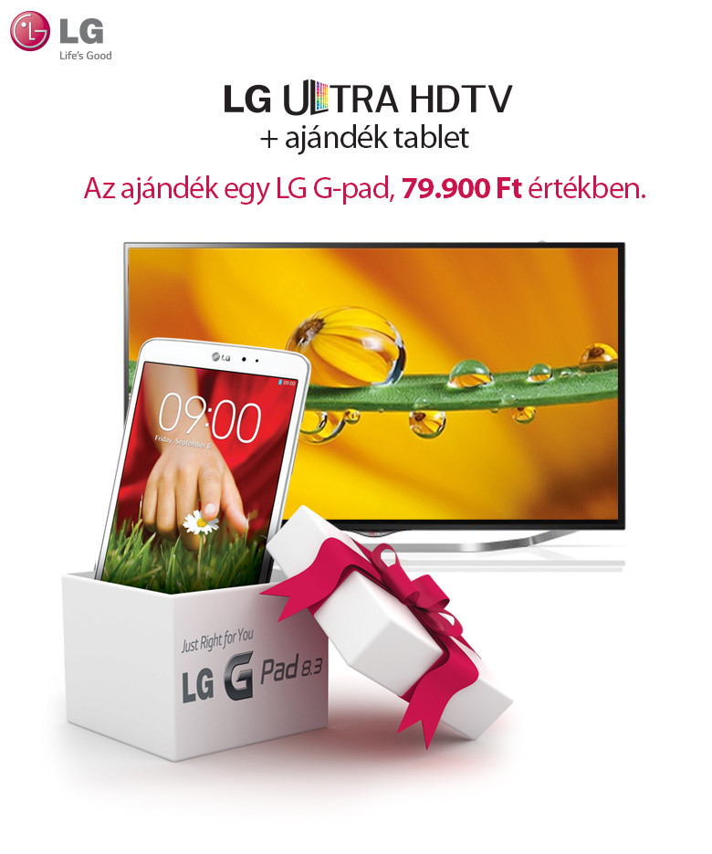 Most minden nálunk vásárolt LG ULTRA HD (4K) TV mellé egy LG G-pad 8,3” tabletet adunk ajándékba.