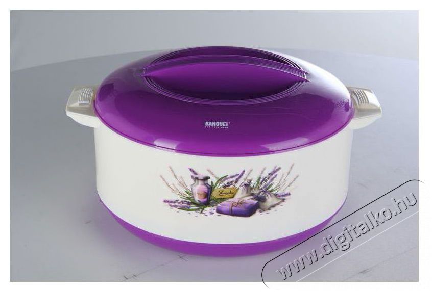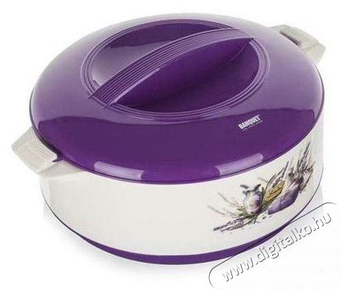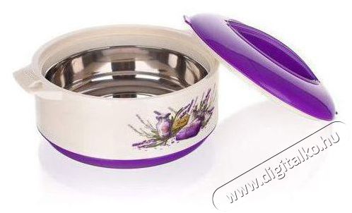 BANQUET Culinaria LEVENDER A03163 A Banquet praktikus, 1,5 literes, fedővel ellátott thermo edénye rekord ideig melegen tartja az ételt. Ez a tulajdonság különösen jól jöhet, ha az elkészült ételt nem azonnal szeretnéd felszolgálni. A belső rozsdamentes acélból készült edény és a külső burkolat között poliuretán hab található, amely kiváló hőszigetelő, így tárolás és szállítás közben melegen tartja az ételt. Ez a praktikus edény levendula mintás kivitelben készült, így stílusos kiegészítője lesz a konyhádnak.