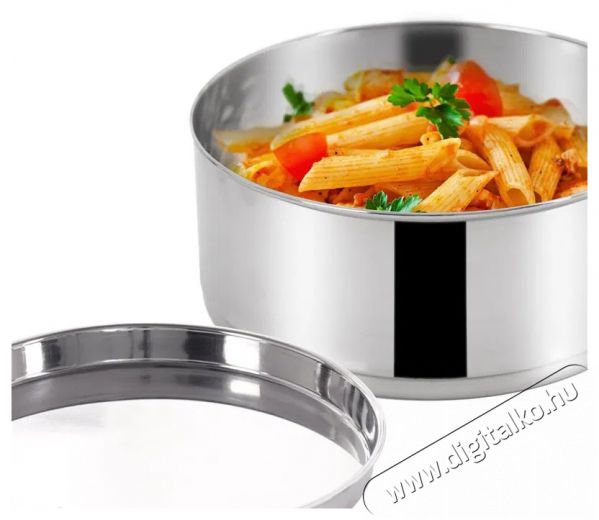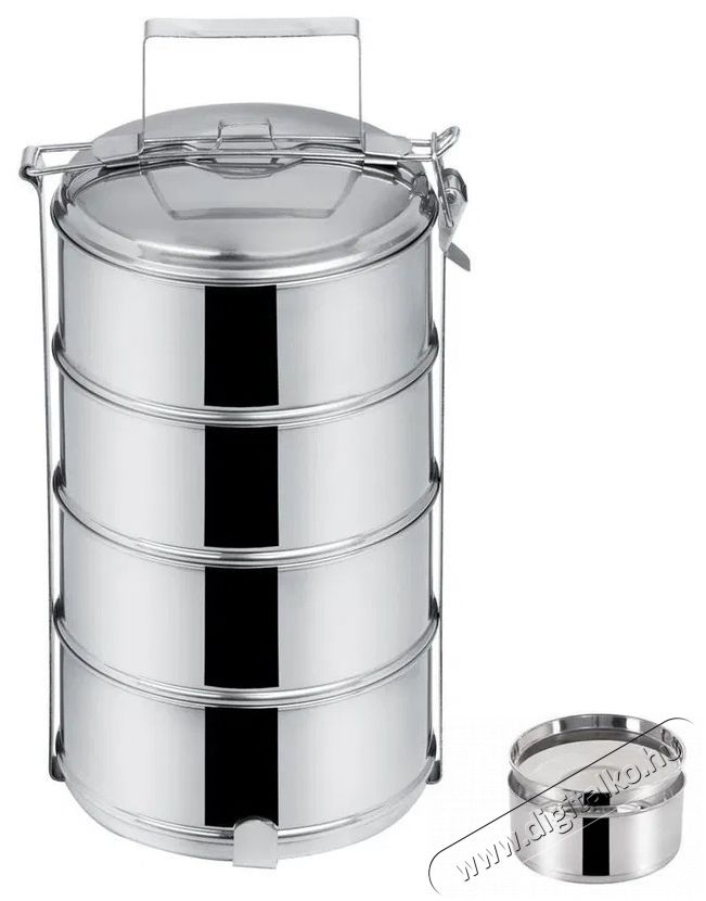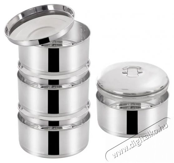 Hordasz ételt a nagyinak, vagy épp fordítva, tőle viszel haza finomságokat? Akkor valószínűleg a konyhaszekrényed már tele van műanyag dobozokkal. Próbáld ki a rozsdamentes acél ételhordót! Négy darab, egyenként 1,3 literes tálból áll, így például könnyedén elválaszthatod a szószt a tésztától. Minden tál átmérője 16 cm, magassága pedig 6,5 cm. Az ételhordó teljes összeállított magassága 33,5 cm. A csomag tartalmazza a tálakat, egy fedőt, három külön fedélrészt és egy fémállványt csattal, amely biztosítja a tálak szoros zárását. Az ételhordó nem alkalmas étel melegítésére, viszont mosogatógépben tisztítható.