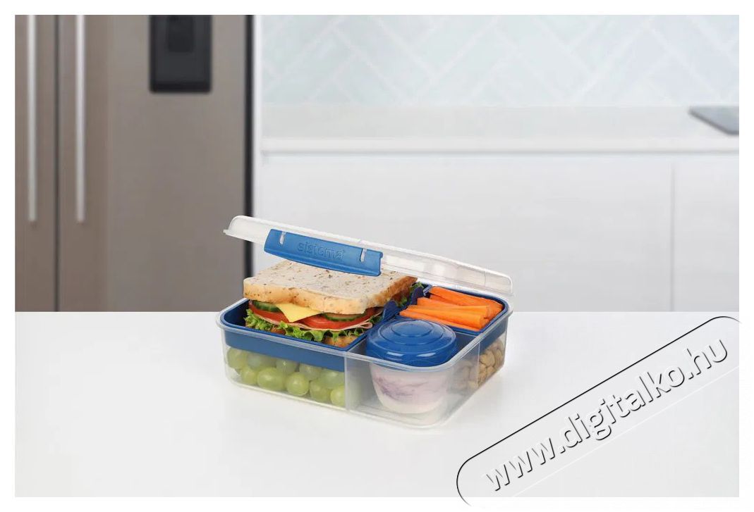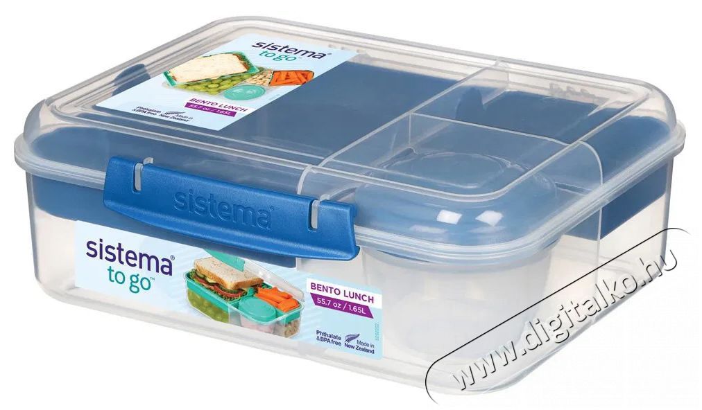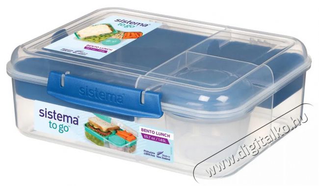 A minőségi Sistema To Go Ételtároló doboz + joghurt tartó, 1,65 l, 3 rekeszes, kék lényeges funkciói- Az igényes kialakítású SISTEMA uzsonnás doboz alkalmas élelmiszer biztonságos szállítására
