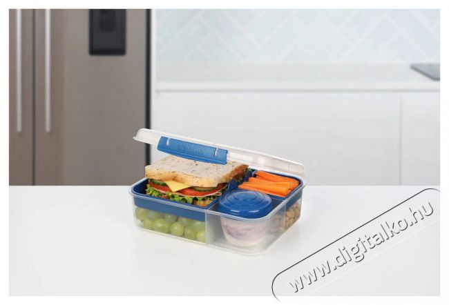 Sistema To Go Ételtároló doboz + joghurt tartó, 1,65 l, 3 rekeszes, kékA jól ismert SISTEMA uzsonnás doboz időt és pénzt takarít meg, és különösen alkalmas a kinti étkezésekhez. Praktikus kialakításával és kapacitásával a kellően nagy 1,7 l térfogat rengeteg helyet teremt kedvenc finomságaid számára. Anyaga műanyag. A belső tér elrendezése nagyon jól átgondolt. A különálló rekeszek különböző élelmiszerek, például gyümölcsök, apróra vágott zöldségek, energiaszeletek vagy bármi más tárolására szolgálnak. Használat után egyszerűen beteheted a mosogatógépbe, így megtakarítod a kézi mosogatással töltött időt. A fedélen lévő klipszek tökéletesen lezárják a dobozt. Ideális tárolóhelyet biztosít joghurtok, krémek, saláták és egyéb snackek számára.