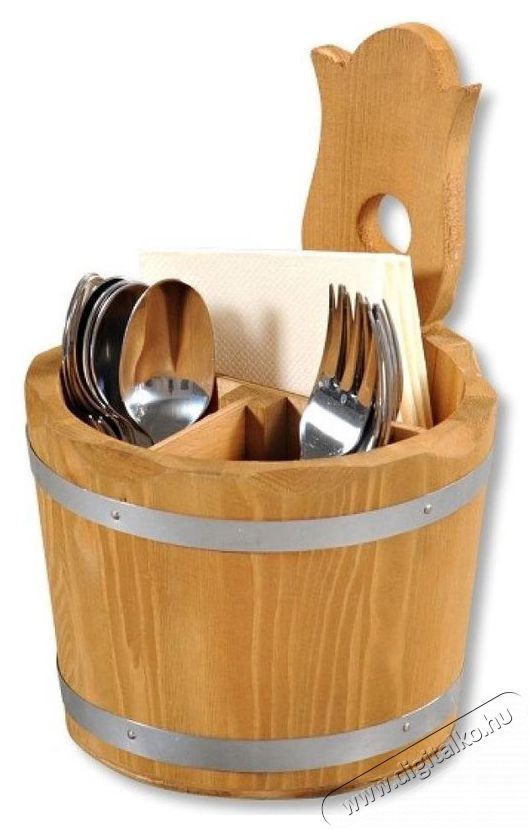 Ez a hordó alakú evőeszköztartó faállvány elsősorban éttermeknek ajánlott, de akár a háztartásokban is használható A belseje 3, elkülönített részre van elosztva. Anyaga festett fa.