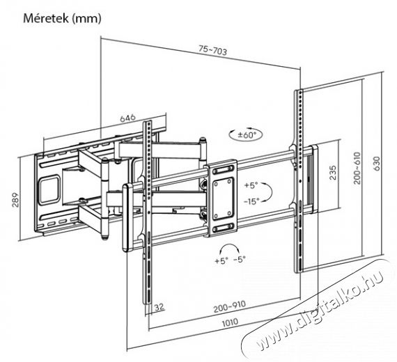 Stansson WM-60120-5-60 60"-120" teljes mozgástartományú fali TV konzol Szabadon dönthető kialakítás: könnyű előrébb vagy hátrább állítás a jobb betekintésért és a kisebb tükröződésért.