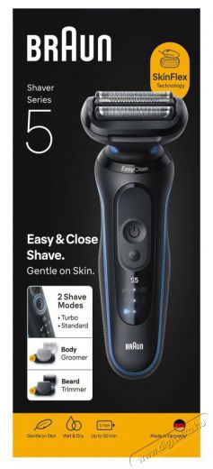 Braun Series 5 Wet&Dry 52-B1650S borotvaTökéletesen sima borotválkozásra vágysz? Akkor itt a Braun Series 5 Wet&Dry 52-B1650S pengés borotva. A hagyományos borotvákkal összehasonlítva sokkal kevesebb húzással érhetsz el tökéletes és precíz borotválkozást. A készülék három éles, rugalmas acélpengével rendelkezik, amelyek pillanatok alatt garantálják a pontos és hatékony formázást. A két penge biztosítja a sima borotválkozást, a középső vágófej pedig eléri a nehezen hozzáférhetőszőrszálakat is. A borotva így könnyedén megbirkózik mind a finom, mind a sűrű, makacs szakállal és szőrszálakkal. A SensoAdapt technológiával elemzi a szakáll sűrűségét, és automatikusan beállítja a motor teljesítményét. A SkinGuard védi a bőrt a sérülésektől és irritációtól. A nagy teljesítményű akkumulátor akár 60 perces vezeték nélküli használatot biztosít. A Braun Series 5 borotva vízálló, nedves és száraz használatra egyaránt alkalmas. Élvezd az otthonod kényelmében a szalonminőségűszakállformázást a Braun Series 5 Wet&Dry borotvával.