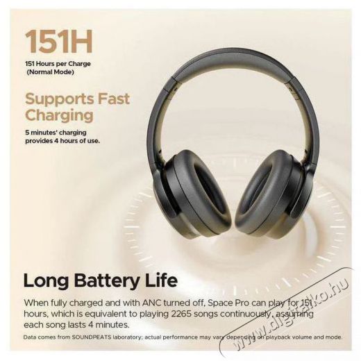 A Soundpeats Space Pro fülhallgató 151 órát bír egyetlen töltéssel. Értékelni fogod a gyorstöltés támogatását - mindössze 5 perc alatt a töltőn további 4 órányi hallgatást kapsz. Ha azonban nem szeretnél szünetet tartani, használhatod az USB- vagy AUX-kábeles csatlakozást is.