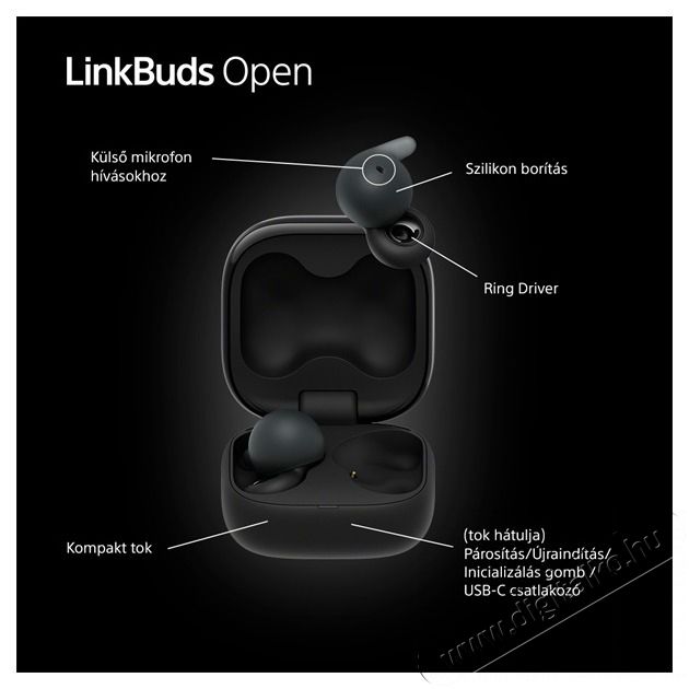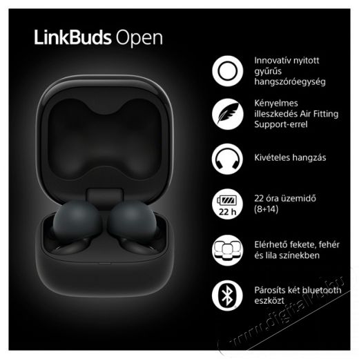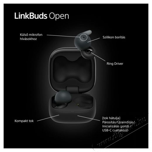 Sony Linkbuds Open - szuper kicsi, könnyű és kényelmes True Wireless fejhallgatóA Sony bemutatja az extra kicsi, könnyű és kényelmes LinkBuds Open fejhallgatót. Meglep téged nagyon könnyű, de mégis minőségi felépítésével. Bár kompakt méretű, 11 mm-es meghajtót tartalmaz, és a hagyományos fülpárnához képest a Sony LinkBuds védőfelülete, ami a membránt fedi, közvetlenül a tokba van integrálva. A True Wireless fülhallgatót úgy tervezték, hogy pontosan illeszkedjen az emberi fülhöz. Ergonomikus kialakításának köszönhetően jobban tart a füledben az új légpárnás betétnek köszönhetően. A fejhallgató akár 22 órás akkumulátor-üzemidőt biztosít, ha a töltőtokkal együtt használod. A Sony LinkBuds beépített mikrofonnal rendelkezik a minőségi telefonhívások kényelmes kezeléséhez, és természetesen az Alexa és a Google Assistant hangasszisztensekkel való kényelmes együttműködéshez. A megbízható kapcsolatot a Bluetooth 5.3 technológia biztosítja az SBC, AAC kodekek támogatásával.
