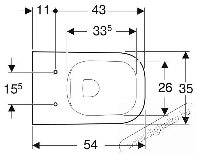 A Rimfree él garantálja az egyszerű karbantartást és nem teszi lehetővé a szennyeződések felhalmozódását. A WC-csésze tágas és nagyméretű fürdőszobákba is illeszkedik, a következő méretekkel: 35 cm széles, 54 cm mély és 33 cm magas.