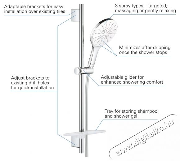 | Csomag tartalma | 1 x Polc 1 x Zuhanycső 1 x Zuhanyoszlop 1 x Zuhanyrózsa |