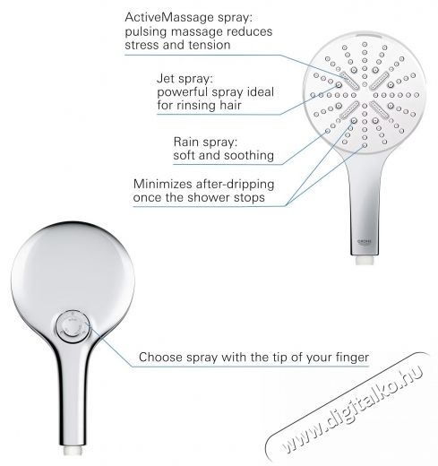 Még soha nem volt ilyen egyszerű élvezni a luxus zuhanyozást! Egyszerűen frissítsen a lenyűgöző GROHE Rainshower 130 SmartActive kézizuhanyra fehér szórólappal, amely gyorsan felszerelhető, és teljesen új szintű teljesítményt kínál a fürdőszobában. Németországban készült, tele van innovatív technológiával, és öröm használni. A GROHE SmartTip – egy ergonomikus vezérlő a fogantyú hátulján – ujjbeggyel irányítható három szórási mintázat – a GROHE ActiveMassage pulzáló spray, amely a masszírozás teljesen új szintjét kínálja, az élénkítő Jet Spray és a Rain Spray, amely olyan gyengéd, mint egy nyári eső. Amikor elzárja a vizet, a GROHE DripStop minimálisra csökkenti a Rain and Jet spray bosszantó csepegését. A GROHE DreamSpray-nek köszönhetően pedig az egyes fúvókák áramlása tökéletesen kiegyensúlyozott a maximális elégedettség érdekében, és a SpeedClean vízkőmentesítő fúvókák is nagyon könnyen tisztíthatók. A strapabíró GROHE StarLight bevonattal ellátott zuhany karcálló, és évekig tiszta marad. Ezenkívül az Inner WaterGuide megakadályozza a felület túlzott felmelegedését, védve a bőrt és a krómozott felületet egyaránt. GROHE Rainshower 130 SmartActive kézizuhany – a stílus és a funkcionalitás intelligens ötvözete karnyújtásnyira!