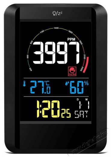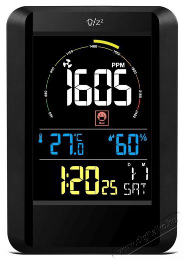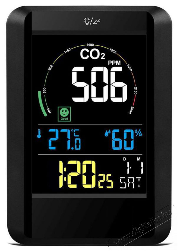 - Kézi időbeállítás, ébresztő (2 időpont), 4 különböző ikon mutatja a CO₂ szint szerinti levegőminőséget