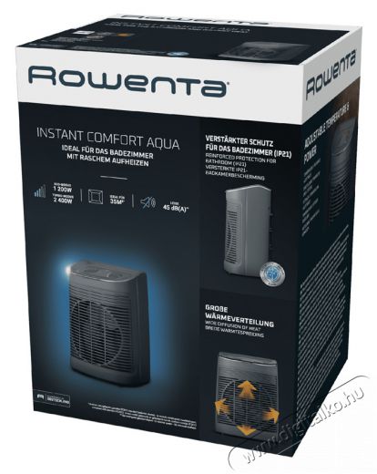 Rowenta SO6511F2 Instant Comfort Aqua ventilátoros hősugárzóA Rowenta Instant Comfort Aqua SO6511F2 ventilátoros hősugárzó melegen tartja otthonodat, műhelyedet, irodádat vagy lakókocsidat. Előnye a vízállóság, ami biztonságos használatot tesz lehetővé még a fürdőszobában is. Két könnyen állítható pozíciót kínál - a csendes ECO-beállítást, amely ideális hosszabb távú használatra, például tévénézés, olvasás, társasjátékozás vagy alvás közben, a maximális teljesítménybeállítás pedig a gyorsabb és hatékonyabb fűtés érdekében akár 35 m²-es helyiségekbe, amikor visszatérsz egy fűtetlen szobába, és gyorsan fel akarod melegíteni. A ventilátor széles hőeloszlása biztosítja a helyiség egyenletes fűtését a maximális kényelem érdekében. A ventilátor kellemes hűtőfunkcióval is büszkélkedhet, hogy a melegebb hónapokban felfrissítse a kis tereket, így egész évben használhatod. Az átlátszó kezelőpanelnek és a nedves körülmények közötti szigetelésre vonatkozó speciális biztonsági szabványnak (IP21) való megfelelésnek köszönhetően használat közben nem kell aggódnod a biztonság miatt. Túlmelegedés esetén a készülék automatikus kikapcsol. Kompakt mérete és ergonomikus fogantyúja praktikus hordozást és tárolást tesz lehetővé.