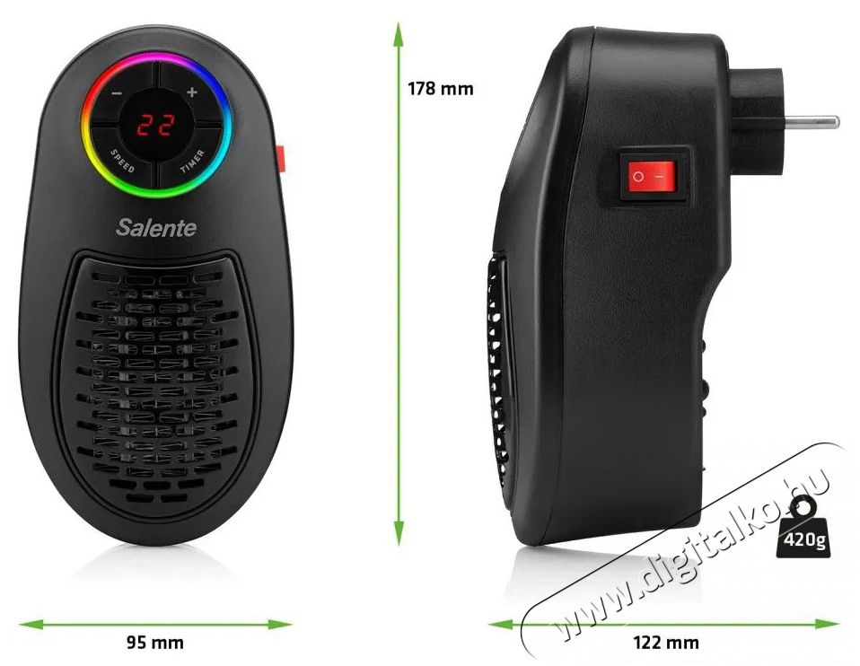 Salente HotHeat feketeEgyszerű és megbízható megoldást keresel a beltér kifűtésére? Akkor a híres SALENTE által készített hűtő fűtő ventilátor egy kiváló választás. Bizonyára értékelni fogod a fűtési teljesítményét, ami 500 W. Összességében 2 teljesítményszint áll rendelkezésre, melynek köszönhetően egyszerűen szabályozhatod a hőfokot. A kompakt SALENTE ventilátoros hősugárzó könnyen áthelyezhető. Működés közben a zajszintje 73 dB. A beépített termosztát nemcsak a beállított hőmérsékletet tartja fenn, de működtetési költségeket is megtakarít. A jobb kezelhetőség és átláthatóság érdekében LED kijelzővel is ellátták. Az időzítő gondoskodik arról, hogy mindig felmelegített helyiségbe térj vissza. A beállított idő leteltét követően automatikusan kikapcsol. Akár 15 m³ légterű szobát is ki tud fűteni.
