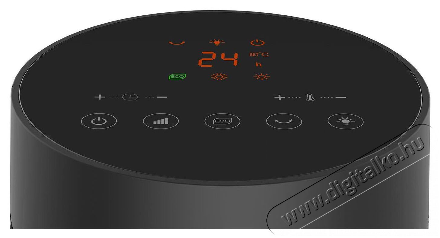 A Salente HotTower tetején digitális vezérlőpanel található színes kijelzővelLehetővé teszi a fűtőberendezés paramétereinek egyszerű beállítását. Ha az ujjoddal megérinted a megfelelő funkció ikonját, a Salente HotTower azonnal reagál. A gombok nélküli kialakítás karbantartása is egyszerű, mivel a panel könnyen letörölhető.