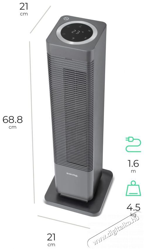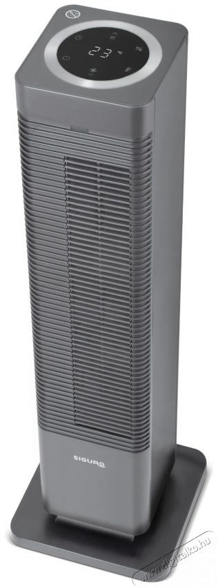 A fűtési hőmérséklet 15 és 35 °C között 1 °C pontossággal, a fűtési teljesítmény és a ventilátor sebessége pedig két fokozatban állítható. A levegő sebessége eléri az 5 m/s-ot. Időzítő funkció is rendelkezésre áll 1 és 12 óra között. Ezen idő letelte után a Siguro HS-R450Y Reindeer Hot & Cool hősugárzó ventilátor automatikusan készenléti üzemmódba kapcsol. A vízszintes oszcilláció (80°) egyszerűen a megfelelő gomb megnyomásával aktiválható, így a levegő egyenletesen melegszik vagy frissül fel.