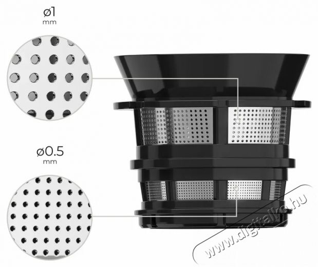 A Siguro SJ-P500DY Juice Pure Press gyümölcsprés rozsdamentes szűrővel rendelkezik, különböző méretű nyílásokkal, amelyek kombinációja lehetővé teszi a maximális lé kinyerését és minimalizálja az alapanyagok veszteségét. A praktikus kifolyózár lehetővé teszi, hogy kényelmesen kicseréld a légtartályt rendetlenség nélkül – egyszerűen zárd el a lé kifolyását a kar segítségével, cseréld ki a poharat, majd nyisd meg újra. Ez jelentősen egyszerűbbé teszi a kezelést a préselés során.