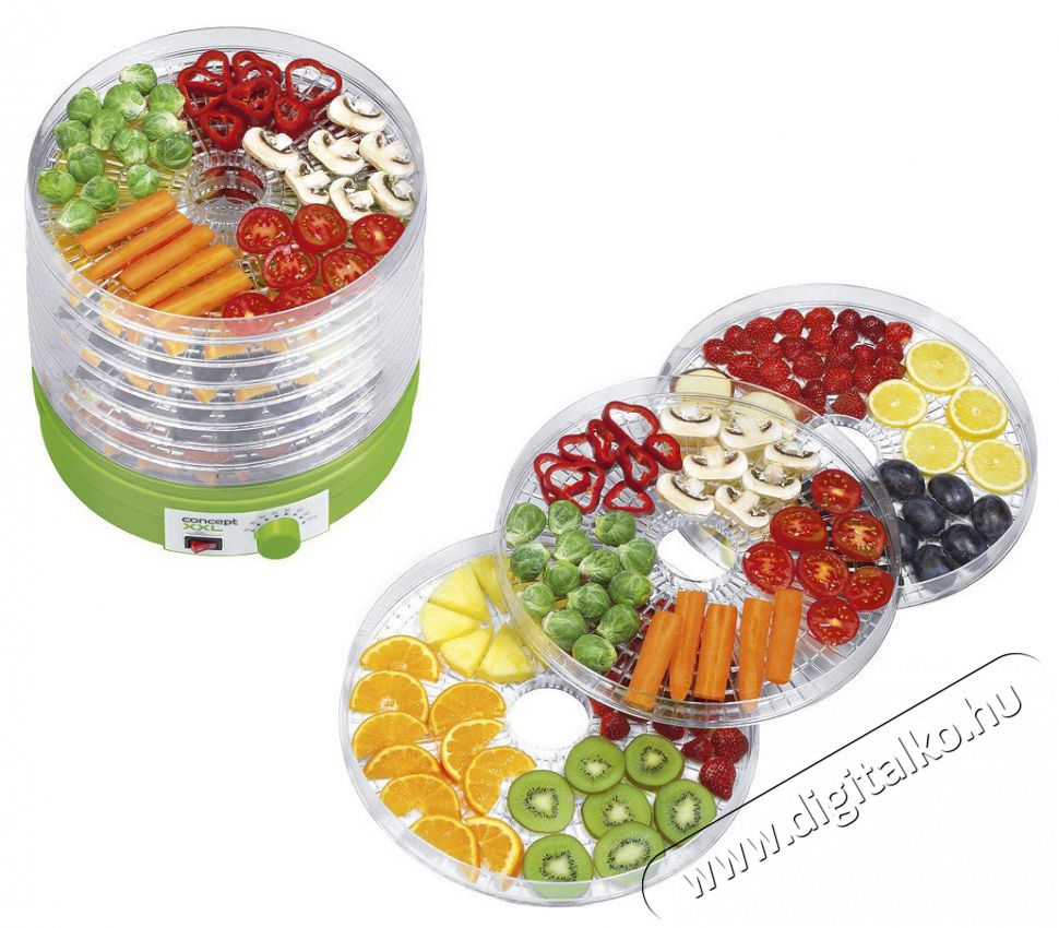 Nagy kapacitású gyümölcs szárítót kínál a cseh gyártó Concept, amely egy egészséges és nagyon egyszerű módja, hogy megőrizze az élelmiszereket. A lehetőségek tárháza. Például, a tél beállta előtt, tud készíteni szárított zöldségeket és gombákat, vagy finom keverékét almának, szilvának, körtének és más gyümölcsöknek. Egy eredeti lehetőség mindenképpen, hogy saját gyógynövény teát készítsen gyógynövényekből. Az előnye a Concept SO1025 aszalónak határozottan a mérete és annak lehetősége, hogy 12 nagy 32cm átmérőjű szitát lehet felhalmozni, így rengeteg gyümölcsöt száríthat egyszerre. A gyümölcsöket elegendő felvágni és a szitahálóra helyezni, majd a 8 hőmérséklet fokozatból egyet kiválasztva a szárító máris munkához lát. Amint a száírtás kész, a hálók egyszerűen moshatóak mosogatógépben.