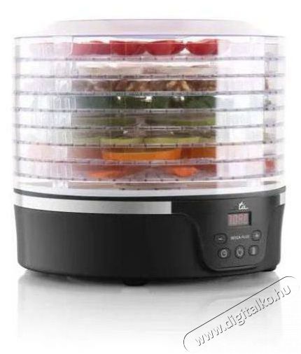 Aszalógép zöldség és gyümölcs szárításához - 380 W teljesítmény segítségével szárítható gomba, fűszernövények, tea, virágok, 8 szárítólemez, szárítólemez átmérője 28,8 cm, kézi vezérlés, időzítő, hőmérséklet szabályozás 35 - 70 °C, átlátszó fedél, túlmelegedés elleni védelem, kijelző, műanyag szárítólemezek, aszalógép anyaga műanyag, mérete 27 × 29,5 × 29,5 cm (Ma×Sz×Mé).