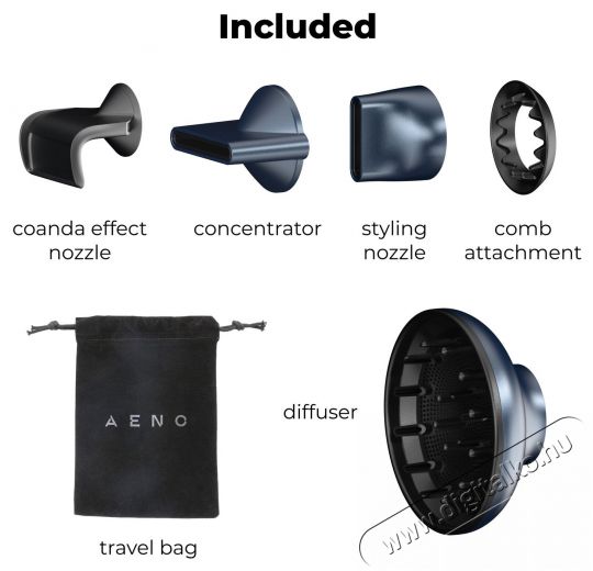5 mágneses tartozék a tökéletes formázáshozHozz létre egyedi stílust a különböző frizurákhoz és alkalmakhoz tervezett öt mágneses tartozékkal. A Coanda hatású simító tartozék sima hajat biztosít, göndörödés és statikus feszültség nélkül, és ideális a fényes és sima megjelenéshez. A diffúzor kiválóan alkalmas természetes hullámok létrehozására és a finom vagy göndör haj volumenének növelésére. A precíz formázás érdekében értékelni fogod a formázó fúvókát, amely segít elérni a kívánt megjelenést. A fésűs tartozékkal könnyedén kiegyenesítheted és kifésülheted a hajadat hajszárítás közben, csökkentve a sima stílus eléréséhez szükséges időt. A koncentrátor célzott légáramlást kínál, amely ideális a finom részletekhez és a tökéletes formázáshoz. Ezekkel a tartozékokkal az AENO HD3 hajszárító egy rugalmas eszköz, amely bármilyen hajformázási igényt képes kezelni.