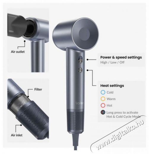 A Laifen Swift Special Silver Blue hajszárító állítható hőmérséklete és két sebességfokozata A Laifen Swift Special Silver Blue hajszárító három hőmérsékleti szinttel rendelkezik. Választhatod a Cold, azaz hideg fokozatot, amely a szobahőmérsékletnek felel meg, a Warm, vagyis meleg fokozatot, amely eléri az 50 °C-ot, és Hot, azaz forrót, amely 80 °C-os levegőt fúj. A Laifen Swift Special Silver Blue hajszárító két sebességfokozatának egyikét is könnyen beállíthatod.