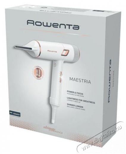 A Rowenta Ultimate Experience Maestria hajszárító segít tökéletesíteni az erőlködéstől mentes, könnyed hajformázás művészetét a kefe nélküli nano motor technológiának köszönhetően. A készülék erőteljes légáramlást biztosít és egy vékony, 5 mm-es koncentrátorral felszerelt a légáramlás fókuszálásához, valamint egy hajtömeget növelő diffúzorral rendelkezik a merész hajhullámok létrehozásához. Ionizáló technológia a sima és fényes hajért, 9 sebesség/hőmérséklet kombináció, kivehető rács a könnyű tisztításért és hideg levegő löket a hosszan tartó stílusért.