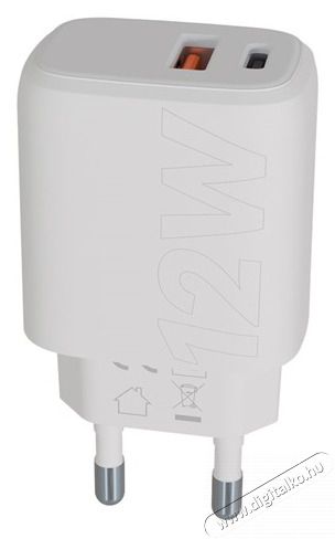 A SPEEDY termékcsaládhoz tartozó CH312W, fehér színű, 12W-os hálózati töltőadapter egy USB-A porttal és egy USB-C töltő porttal rendelkezik, lehetővé téve két eszköz egyidejű töltését.