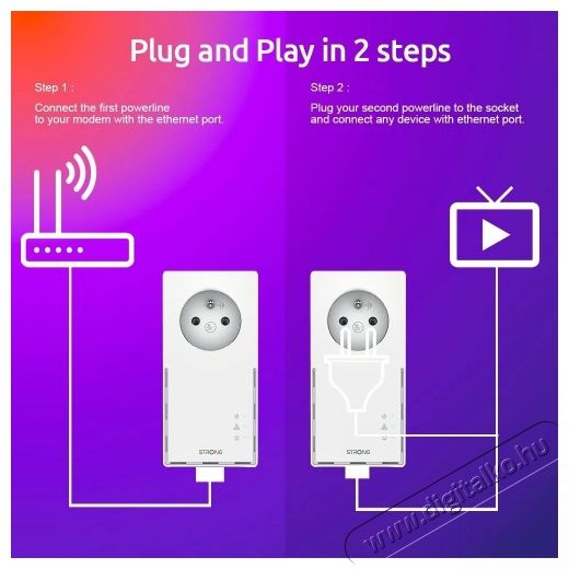 Internet bárhol az otthonodban a Strong Powerline 1000 TRI FR segítségével, 3 db csomagbanA Strong Powerline 1000 TRI FR adapterkészlet lehetővé teszi, hogy a meglévő elektromos vezetékeken keresztül használhasd az internetet otthonodban. Egyszerűen csatlakoztasd a mellékelt adaptereket az elektromos aljzatokba, majd csatlakoztasd a LAN-kábelt. Ez stabil vezetékes internetet biztosít még egy nagy lakásban vagy házban is. Ráadásul az adapterek átmenő aljzattal rendelkeznek, így még csak el sem veszíted a hálózati aljzatokat.