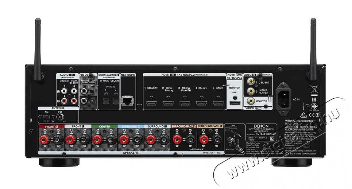 - 6 HDMI bemenet (1x elöl) és 1 HDMI kimenet teljes HDCP 2.2 támogatással