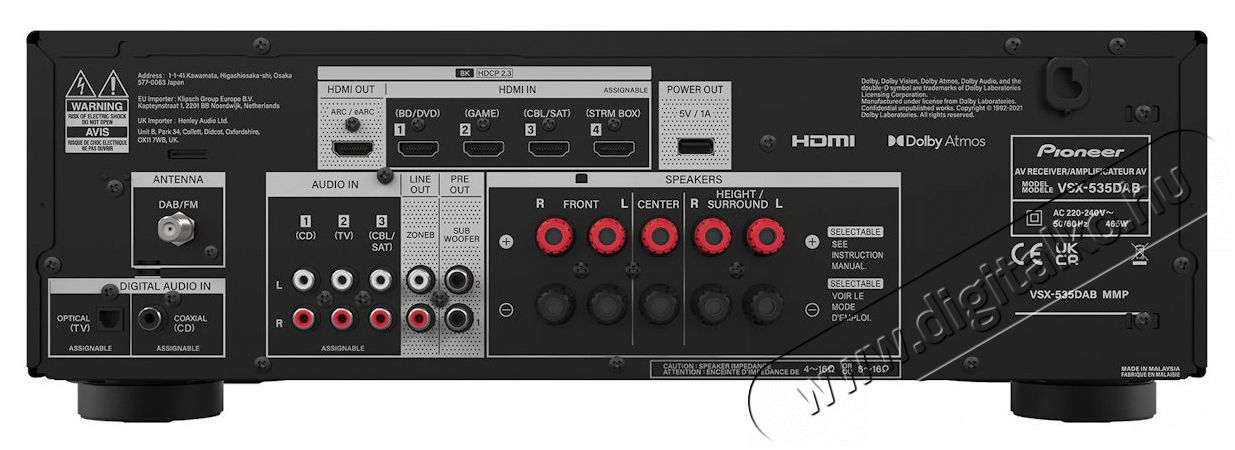 A jó minőségű Pioneer VSX-535D AV rádióerősítő csatlakoztathatósága Ehhez az AV rádióerősítőhöz digitális és analóg audiojel is csatlakoztatható. Továbbá a felszereltségből a hasznos HDMI ki- és bemeneti konnektor sem hiányzik. A hangsugárzók csatlakoztatásához a kiváló PIONEER av-rádióerősítő 5 db kimenetet kínál. Emellett subwoofert is csatlakoztathatsz hozzá, amely szükségszerű a teljes értékű zenehallgatáshoz. Ráadásul analóg kimenettel ugyancsak rendelkezik. Egy minőségi fejhallgató csatlakoztatása után zavartalanul hallgathatod a tartalmakat. Az AV rádióerősítő egyéb csatlakoztathatóságát USB és Bluetooth alkotja.