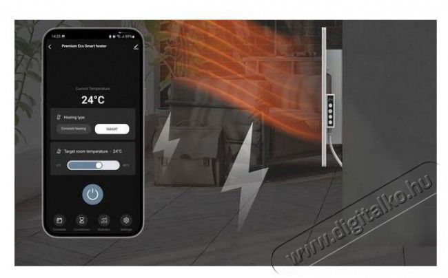 Vezéreld az ANEO GH3S elektromos fűtőberendezését bármikor és bárhol a mobilalkalmazással. Állítsd be a panel hőmérsékletét 60 és 120 °C között, figyeld az aktuális szobahőmérsékletet, vagy állítsd be a szoba hőmérsékletét. Mindent egy helyen találsz. Egyszerűen töltsd le az alkalmazást Android vagy iOS mobiltelefonra.A Wi-Fi kapcsolatnak köszönhetően könnyedén vezérelheted a fűtést távolról, amikor például a munkahelyen, a nyaralóban vagy a boltban vagy.