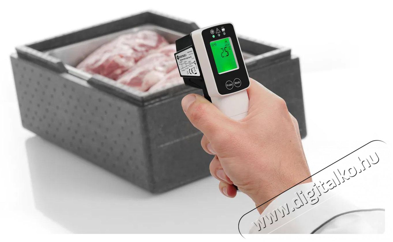 A híres Hendi digitális konyhai hőmérője egy nagyon praktikus konyhai segédeszköz. Inkább főzéshez tervezték. A húsok, sonkák és pástétomok maghőmérsékletének ellenőrzéséhez ideális. Mérési tartománya -60 °C-tól indul és 350 °C-ig terjed. A kijelző háttérvilágításának köszönhetően könnyebb leolvasni az értékeket. A neves Hendi konyhai hőmérőjének tápellátásáról 2× AAA elem gondoskodik, amelyeket külön kell beszerezni, mivel nem részei a csomagnak.