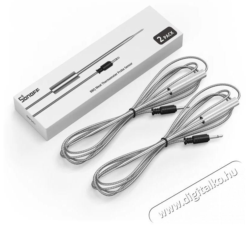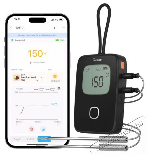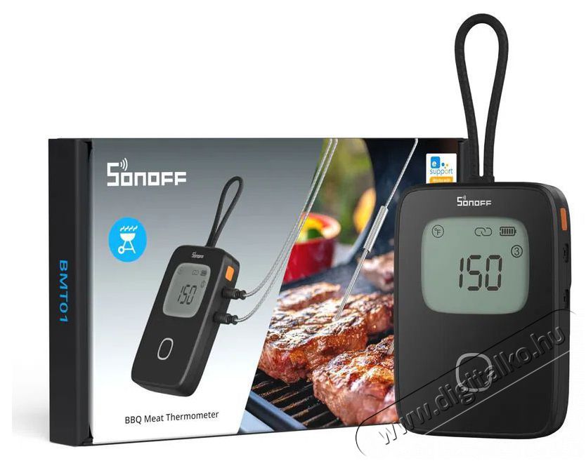 Okos konyhai hőmérő grillezéshez, sütéshez és főzéshezA SONOFF BBQ Meat Thermometer BMT01 konyhai hőmérővel tökéletesen tisztában lehetsz a hús hőmérsékletével grillezés és sütés közben. A SONOFF konyhai hőmérő két hőmérsékletszondával van felszerelve, amelyek 0 és 300 °C közötti tartományban képesek mérni. Az eWeLink alkalmazásban könnyedén beállíthatod a célhőmérsékletet, és kihasználhatod az olyan intelligens funkciók előnyeit, mint az időzítő, a hangjelzés és az előriasztás, hogy a végső beállításoknál előnyt élvezhess. Ezenkívül nemcsak a hús, hanem a sütő vagy a grill hőmérsékletét is ellenőrizheted. A mérési előzményeknek köszönhetően javíthatod a technikádat, és minden alkalommal tökéletes eredményeket érhetsz el. A SONOFF BBQ Meat Thermometer BMT01 konyhai hőmérő két AAA elemmel működik, és négy szondára bővíthető.