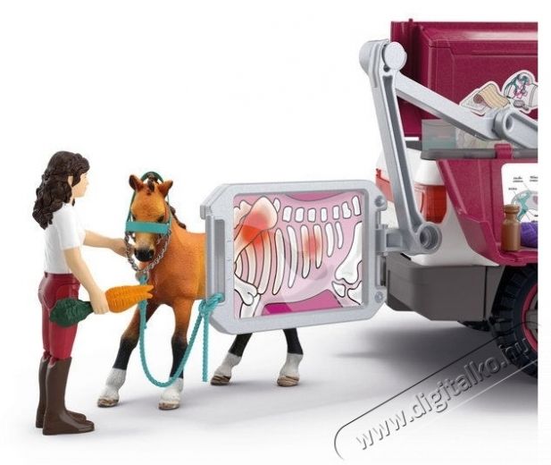 A csomag tartalma:pick-up jármű, utánfutó, egy állatorvos figura, Tennessee Walking Horse csikó (tennessee-i ügetőcsikó), Röntgen gép, 3db röntgenfelvétel, ragtapasz, gyógykenőcs, egy szórófejes flakon, gyógyszeres üveg, szőrápoló kefe, egy csokor sárgarépa, türkiz ápoló kantár, összeszerelési útmutatók, lap matricákkal
