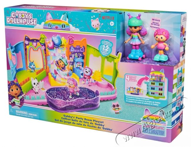 A Party szoba egy fedett gördeszkaparkot és bájos kis erkélyeket rejt mini játékokkal, amelyek még több szórakozást kínálnak. Minden elem könnyedén összeilleszthető Gaby varázslatos házának különböző verzióival, így a gyerekek saját egyedi világokat alkothatnak, tele kalandokkal és fantáziával!