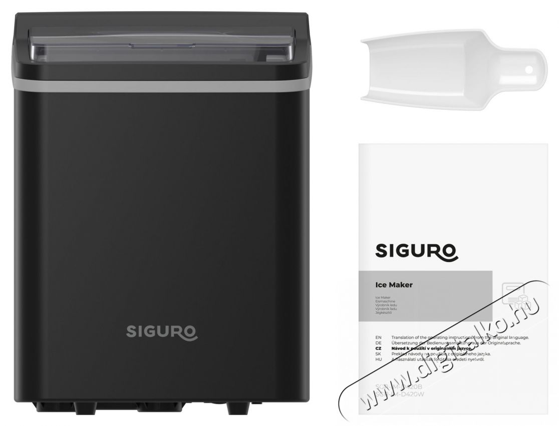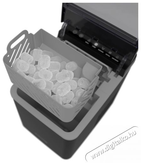 A jégkészítési ciklus automatikusan megszakad, ha a víztartály kifogy, vagy ha a jégtartály megtelik. A kivehető tartály, valamint a tisztítási mód megkönnyíti a készülék karbantartását. Kellemes előnye a lefolyónyílás, amellyel könnyen leengedheted a maradék vizet a készülékből. Magán a jégkészítőn kívüla Siguro IM-D420B Ice Gem csomagjaegy műanyag kanalat tartalmaz a jég kiszedéséhez.