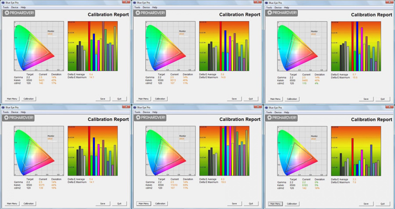 Egy kalibrátorral, illetve a LaCie Blue Eye Pro névre hallgató alkalmazás segítségével vettük szemügyre tüzetesebben az előzetes beállításokat. Ezek sorrendben: Energiatakarékos, Élénk, Játék, Normál, Sport, THX Mozi, THX Bright Room. A kép jobb oldalán látható, hogy a bemért 18 szín milyen mértékben tér el a referenciától. Ennek meghatározására használatos a DeltaE, ami egy olyan numerikus érték, amely két különböző szín távolságát határozza meg egy színrendszeren belül. Minél kisebb a DeltaE értéke egy adott színnél, annál közelebb áll a referenciához, vagyis annál jobb.