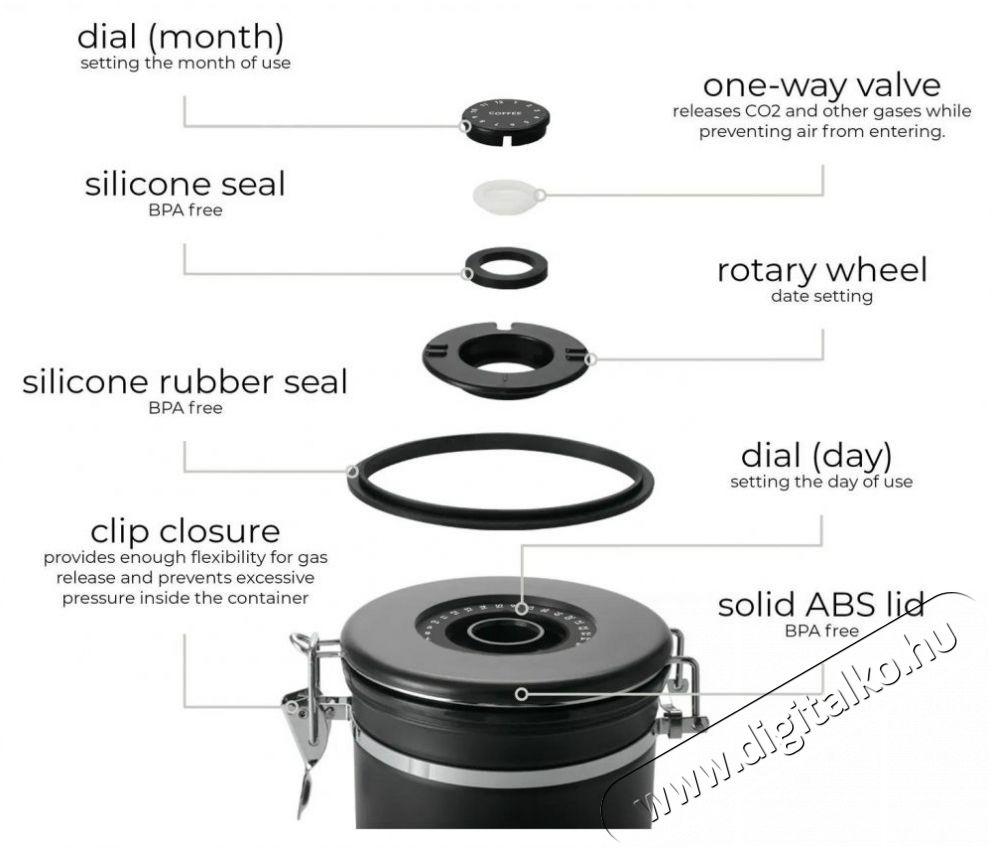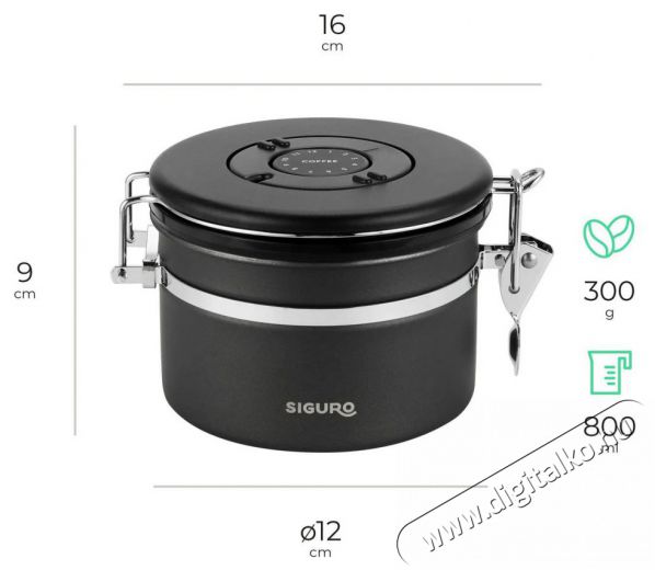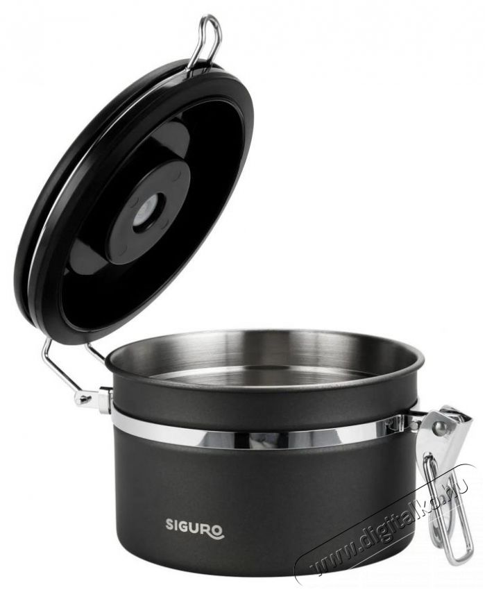 A legjobb feltételek a tovább friss kávébabok számáraEgyszerűen öntsd a kávébabokat a Siguro Elite Brew tárolóedénybe, majd zárd le a szilikonos fedéllel és a csíptetővel, amely megakadályozza, hogy túl nagy nyomás alakuljon ki benne. A fedél tetején található tárcsa és a tekerőgomb segítségével beállíthatod a szavatossági időt. Értékelni fogod, hogy az összes műanyag és szilikon alkatrész BPA-mentes, ezáltal teljesen biztonságos az egészségre.