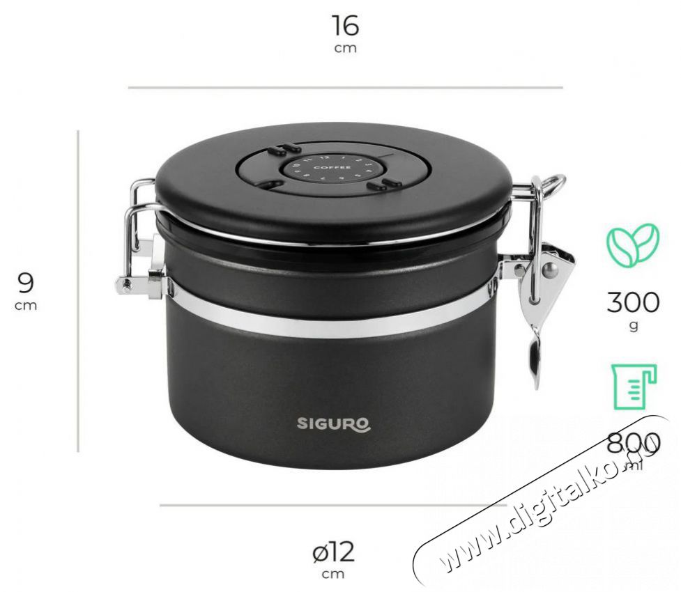 Siguro Elite Brew kávétároló edényA Siguro Elite Brew kávétároló edénnyel a kávébabok mindig a legjobb formájukat hozzák. A tárolás során számos tényező (fény, páratartalom, szagok stb.) befolyásolja a kávét, amelyektől az edényben tárolásnak köszönhetően a lehető legjobban megvédheted. Így a kávé ízprofilja nem fog megváltozni, és a lehető legteljesebben kiélvezheted. A tárolóedény 800 ml űrtartalmú és 300 g kávébabot képes tárolni, kiváló minőségű rozsdamentes acélból készült, szilikon tömítéssel és klipszes záródással ellátott fedéllel, egyutas szeleppel vagy tárcsával rendelkezik a fogyasztás napjának beállításához.