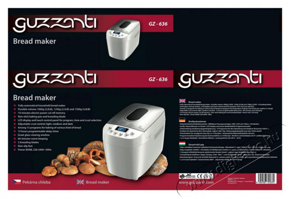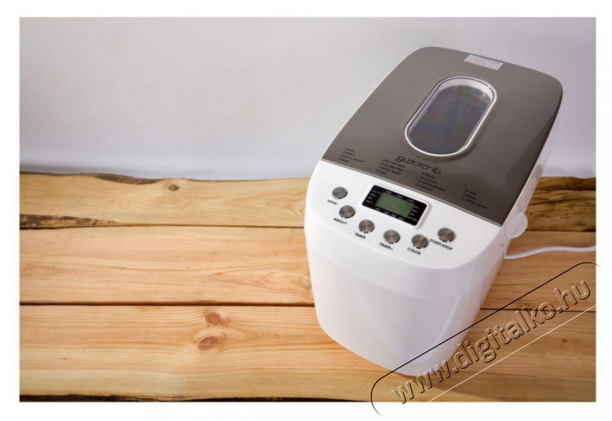 A Guzzanti GZ 636 otthoni kenyérsütő egy teljesen automata gép, amely a saját igényeid szerint, házilag készült ropogós kenyeret süt 1500 gramm tömegig. Háromféle súlyú kenyér közül választhatsz: 1000, 1250 és 1500 gramm. A kenyérsütőt 15 automatikus programmal, időzítővel és 60 perces, melegen tartó funkcióval is ellátták. Minden előbeállítás az érintésvezérlővel történhet, amely egy könnyen leolvasható LCD-képernyőn jelenik meg. Egy másik funkció a kéreg barnasági fokának beállítása - világos, közepes vagy barnára pirított is lehet. A különböző kenyérfajták mellett a készülékben író, joghurt, lekvár vagy pizza- és süteménytészta is készíthető. A késleltetett indítás funkció lehetővé teszi, hogy a sütés megkezdését akár 15 órával is késleltesd. A forma tapadásmentes felülete és a csomagban található dagasztóhorog is biztosítja a könnyű karbantartást. A csúszásmentes gumilábaknak köszönhetően a pulton való biztonságos elhelyezés sem lesz majd gond.