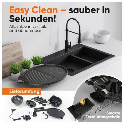 • Könnyen tisztítható - a grilllap, a páraelszívó és a termosztát kivehető, a zsírcsepp tálca kivehető - az extra egyszerű tisztítás érdekében