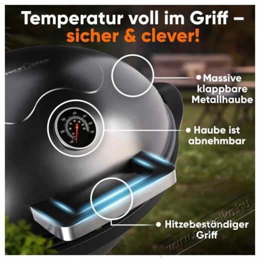 • Minden ellenőrzés alatt - A kiváló minőségű fém páraelszívó hőmérséklet-kijelzővel, Cool-Touch fogantyúval és 90°-os zárral különösen kényelmessé teszi a grillezést a kültéri elektromos grillsütővel
